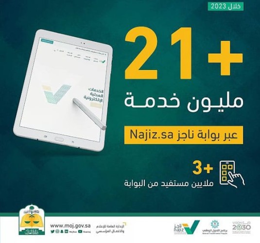 قدمت بوابة الخدمات العدلية الإلكترونية “ناجز Najiz.sa” خلال العام الجاري 2023، خدماتها لأكثر من 3 ملايين مستفيد، دون الحاجة لزيارة المقرات العدلية، عبر تمكينهم من خدمات القضاء، التنفيذ، التوثيق، وغيرها من الخدمات عن بعد، بنفس الجودة والكفاءة.