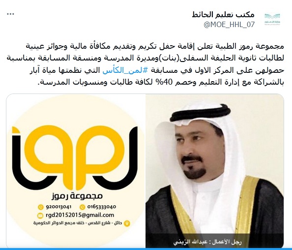 وجاء التكريم للطالبات ومديرة المدرسة والمنسقة بمناسبة حصولهن على المركز الأول في مسابقة “لمن الكأس” والتي نظمتها مياة آبار، بالشراكة مع إدارة التعليم وخصم 40% لكافة طالبات ومنسوبات المدرسة.