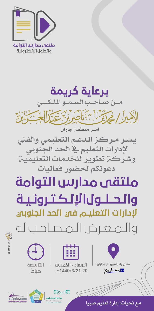 يرعى صاحب السمو الملكي الأمير محمد بن ناصر بن عبدالعزيز أمير منطقة جازان الأربعاء القادم ملتقى التوأمة والحلول الإلكترونية والذي تستضيفه إدارة تعليم صبيا على مدى يومين في فندق راديسون بلو بجازان، بمشاركة من جهاز الوزارة وشركة تطوير للخدمات التعليمية وخمس إدارات تعليمية تمثل إدارات الحد الجنوبي “جازان، ونجران، وسراة عبيدة، وظهران الجنوب، بالإضافة لتعليم صبيا”.