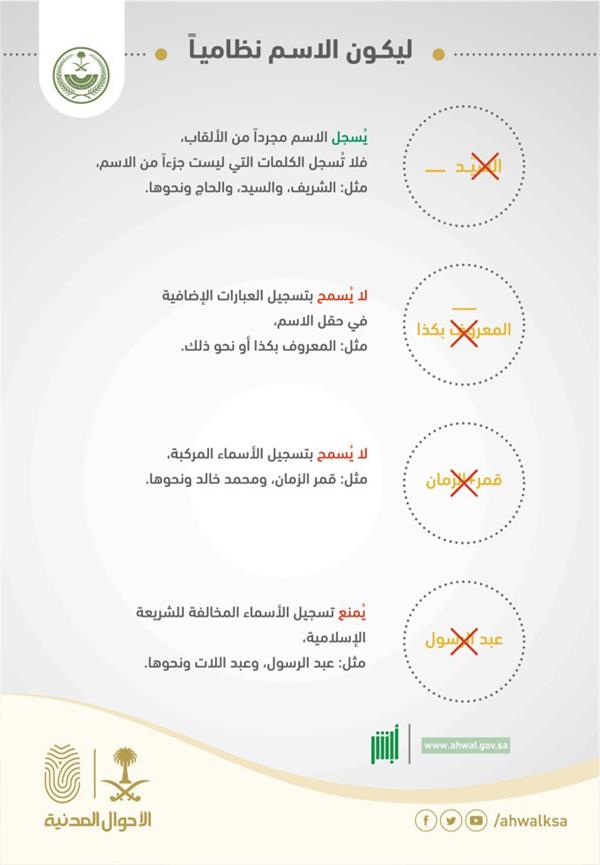 كشفت “الأحوال المدنية” عن عدة ضوابط لتسجيل أسماء المواليد، حيث أوضحت أنه ليكون الاسم نظاميا، يجب أن يكون خاليًا من الألقاب، التي ليست جزءًا من الاسم، مثل “الشريف والسيد”، ونحو ذلك.