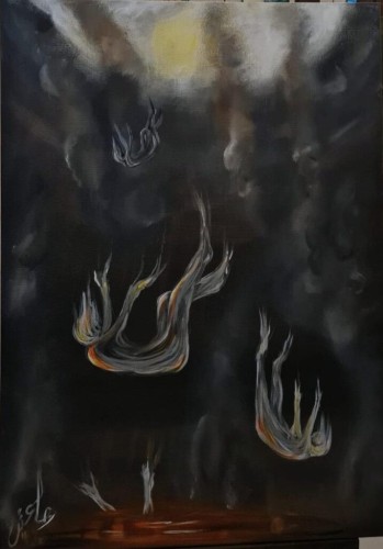 إنتهت الفنانة التشكيلية المبدعة رجاء أحمد عتين خريجة ثانوية عامة من محافظة العيدابي من رسم لوحتها الفنية(فوهة الجحيم)والتي تعبر عن اضرار المخدرات على الفرد والمجتمع.