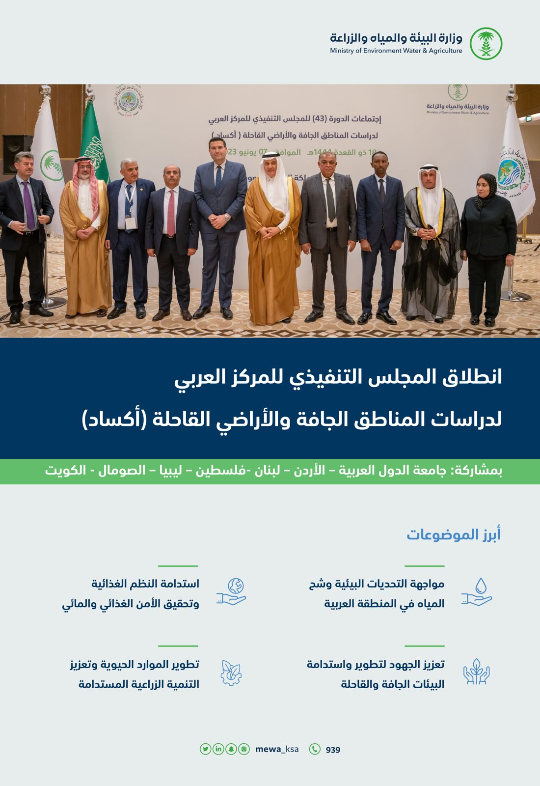 جاء ذلك خلال كلمة معاليه في افتتاح أعمال الدورة الثالثة والأربعين للمجلس التنفيذي للمركز العربي لدراسات المناطق الجافة والأراضي القاحلة (أكساد)؛ التابع لجامعة الدول العربية؛ التي أقيمت اليوم في الرياض برئاسة المملكة العربية السعودية، وبمشاركة عدد من الوفود العربية.