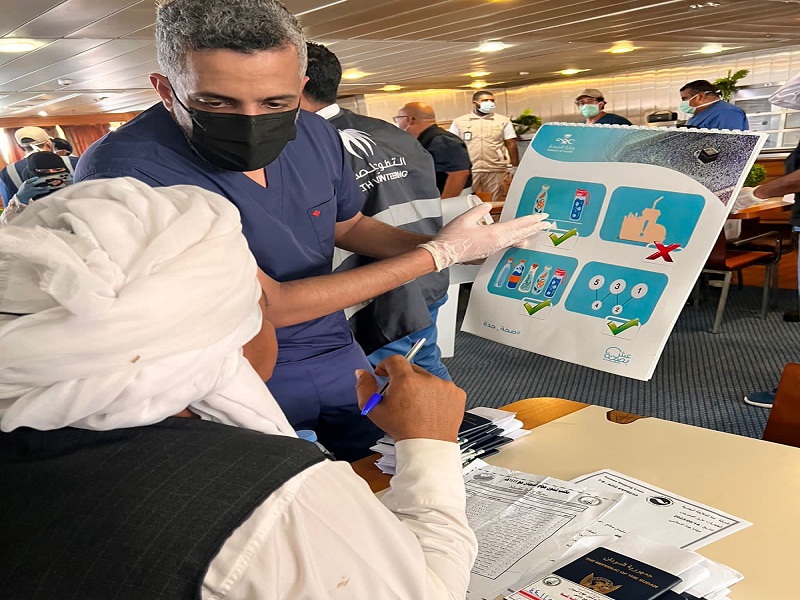 وأوضحت الوزارة أن فريق عمل متكامل تابع لمراكز المراقبة الصحية بميناء جدة الإسلامي بقيادة مدير مركز المراقبة الصحية باشر استقبال الحجاج ، للاطمئنان و الإشراف على تنفيذ الخطط الصحية و الوقائية لتوفير الرعاية الصحية لأول فوج حجاج يصل عبر البحر ، من أجل استيفاء كافة الجوانب الطبية و الوقائية و التوعوية ، و تطبيق كافة الاشتراطات الصحية لمنع وفادة الأمراض المعدية و الوبائية ، و منذ الوهلة الأولى لوصول الحجاج قام المختصين بمركز التفتيش الصحي للسفن بمعاينة جميع القادمين للتأكد من سلامتهم الصحية ، حيث شملت مراجعة كروت التطعيم مع إعطاء الحجاج العلاج الوقائي لمنع حمل الميكروب المسبب لمرض الحمى المخية الشوكية ، كما قامت اللجان التوعوية بإدارة التواصل و العلاقات و التوعية بصحة جدة بالتنسيق مع قسم التوعية بـمركز المراقبة الصحية باستكمال الجانب التوعوي للحجاج من خلال مواد مرئية عبر الشاشات و معدة مُسبقاً في صالات إستقبال الركاب بالميناء ، إضافة إلى المواد المطبوعة عبر البوسترات و تٌقدم من خلالها التوعية للحجاج وجهاً لوجه من خلال استخدام أداة إرشادية مصورة ( بوستر تعريفي ) و لوحات بمقاسات مختلفة موضح فيها طرق الوقاية و الإرشادات التي يجب إتباعها الحاج لحج آمن و صحي ، كما تم توزيع المطويات و البروشورات على ضيوف الرحمن و التي تشمل نصائح و إرشادات توعوية و تثقيفية مختلفة .