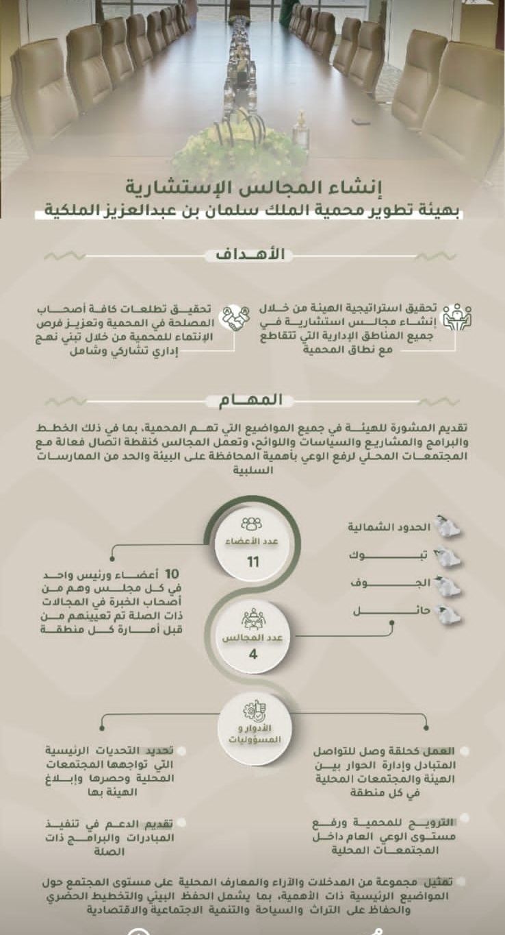 تسعى هيئة تطوير محمية الملك سلمان بن عبدالعزيز الملكية من خلال استراتيجيتها إلى تبني نهج إداري تشاركي وشامل يحقق تطلعات كافة أصحاب المصلحة في المحمية وذلك لتعزيز فرص الانتماء للمحمية لذلك عملت الهيئة ضمن جهودها في تحقيق استراتيجيها على إنشاء 4 مجالس استشارية في جميع المناطق الإدارية التي تتقاطع مع نطاقها (تبوك، الجوف، الحدود الشمالية، حائل). حيث أن المجلس سوف يعمل على تقديم المشورة للهيئة في جميع المواضيع التي ترى الهيئة مشاركتها مع المجلس مثل (خطط الإدارة والبرامج والمشاريع والسياسات واللوائح وغيرها)، على أن يقوم المجلس بتقديم رأيه في جميع المواضيع المطروحة، كما سوف يعمل المجلس على ايصال المتطلبات والمقترحات والتحديات والعوائق التي تواجه المجتمعات المحلية إلى هيئة تطوير المحمية بالإضافة إلى عمله كنقطة اتصال فعالة مع المجتمعات لرفع الوعي بأهمية المحافظة على البيئة والحد من الممارسات السلبية تجاهها مثل الصيد أو الرعي الجائر او الاحتطاب وغيرها، و يعد المجلس أيضاً أحد أهم القنوات لقياس مدى تأثر المجتمعات المحلية بقرارت وأنشطة الهيئة في جميع المناطق، وبدورها سوف تقوم الهيئة بدراسة تلك المقترحات والتحديات وتزويد المجالس بالتغذية الراجعة بشأن جميع المواضيع المطروحة.