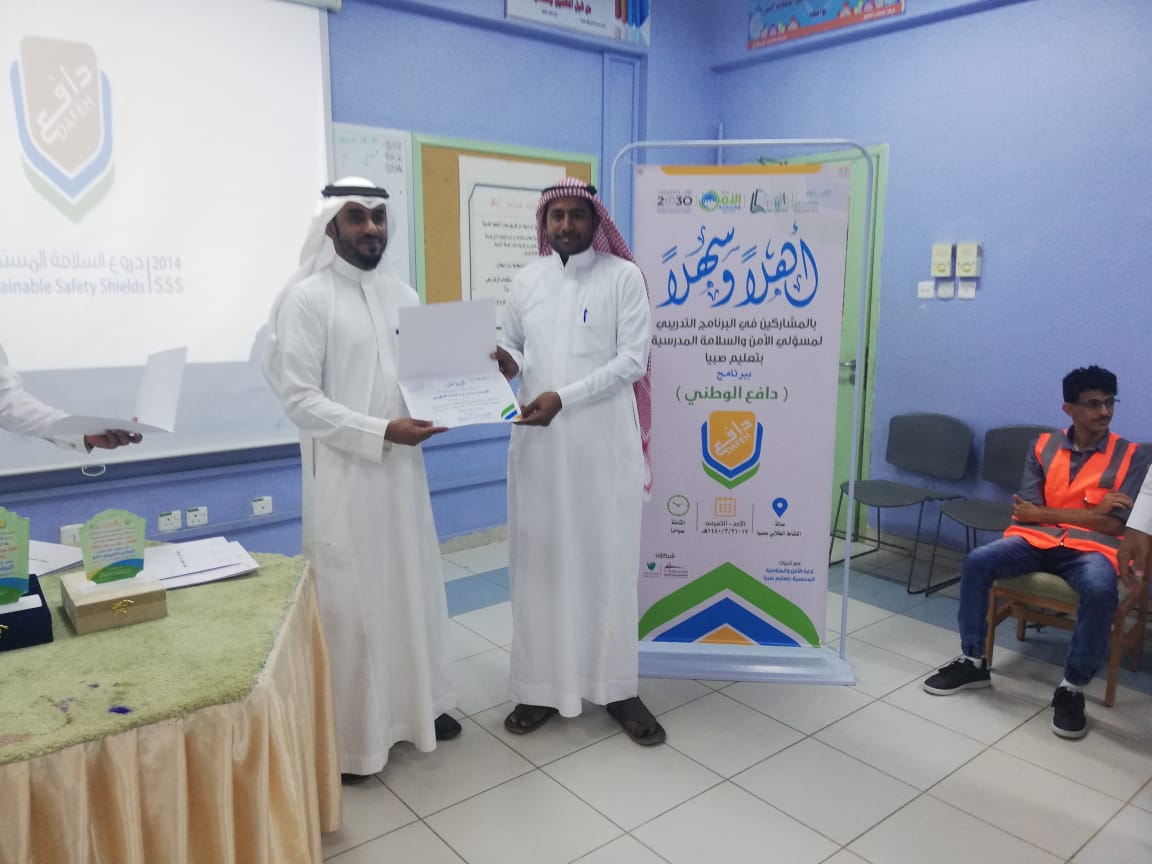 أقامت إدارة تعليم صبيا ممثلة بقسم الامن والسلامة المدرسية دورة (دافع الوطني ) بواقع ٢٥ ساعه تدريبيه لمنسقي ومشرفي الأمن والسلامة بالمكاتب التابعة لها وقدم البرنامج الاستاذ حسن جعفري والاستاذ علي عروي واشتمل البرنامج على الإسعافات الأولية وكيفية التعامل مع الاصابات بمختلف انواعها والتعرف على طفايات الحريق وكيفية استخدامها وأنواع الكوارث وفي نهاية البرنامج تم تكريم المشاركين