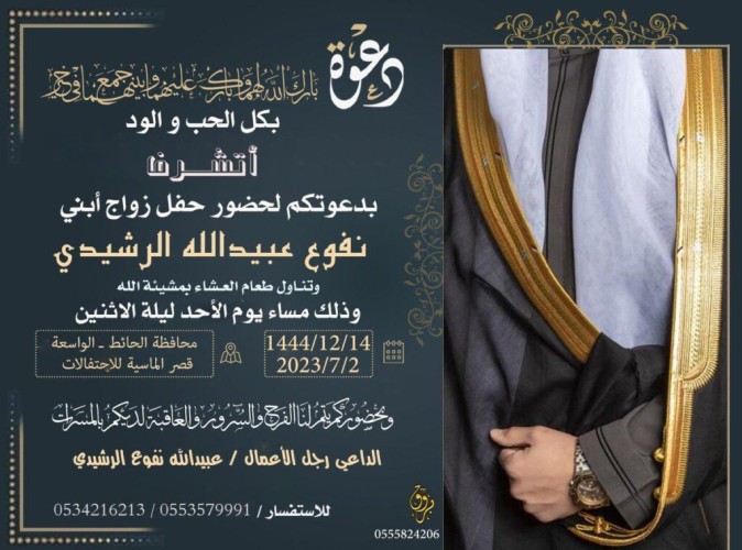 بليلة يزفها الفرح زفاً ويزهو بها الجمال زهواً دعا “عبيدالله بن نفوع بن شويلع الرشيدي” حضور حفل زواج نجله الأستاذ ” نفوع ” وذلك مساء يوم الأحد ليلة الأثنين الموافق 14– 12– 1444هـ بتاريخ 2/ 7 / 2023م.