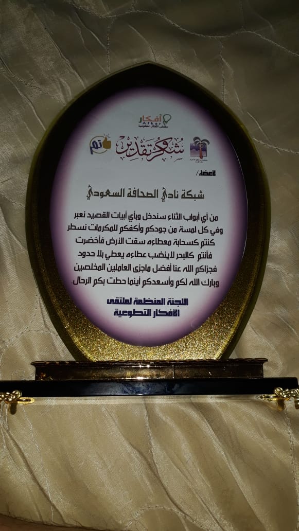 ثم قدم الأستاذ حارث عسيري درع الملتقى التكريمي للاستاذ عبدالله عسيري لدعمه وتشريفه حضور الفعاليه وتسليم الدروع التكريمية للرعاةوالمنظمين والمشاركين