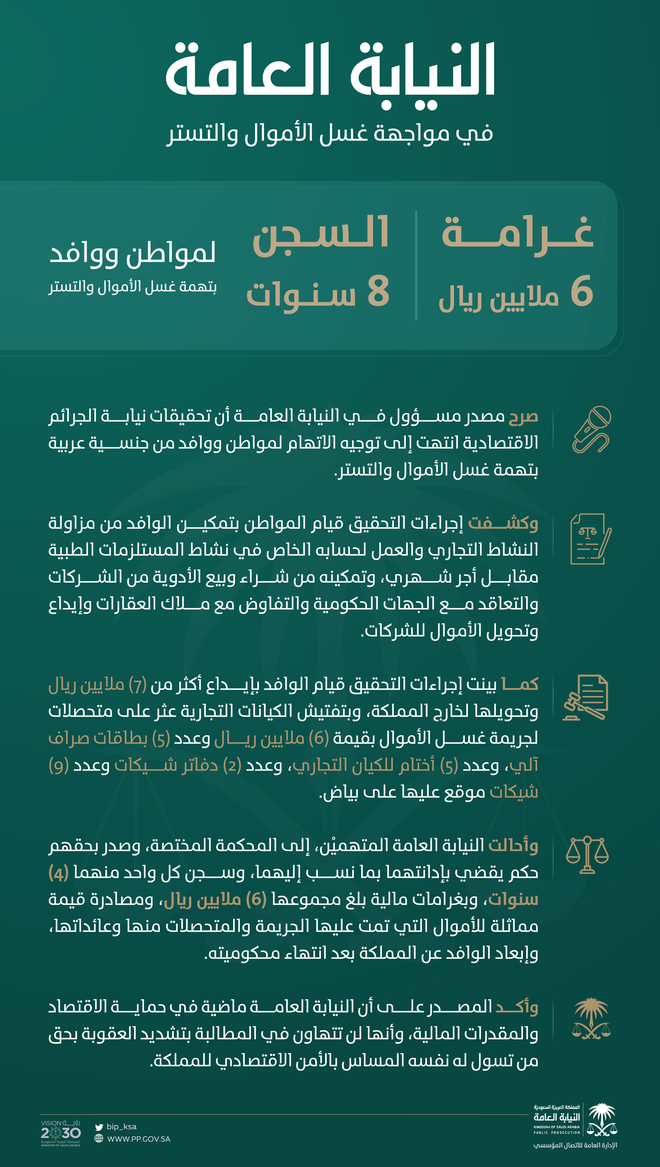 وأحالت النيابة العامة المتهميْن، إلى المحكمة المختصة، وصدر بحقهم حكم يقضي بإدانتهما بما نسب إليهما، وسجن كل واحد منهما (4) سنوات، وبغرامات مالية بلغ مجموعها (6) ملايين ريال، ومصادرة قيمة مماثلة للأموال التي تمت عليها الجريمة والمتحصلات منها وعائداتها، وإبعاد الوافد عن المملكة بعد انتهاء محكوميته.