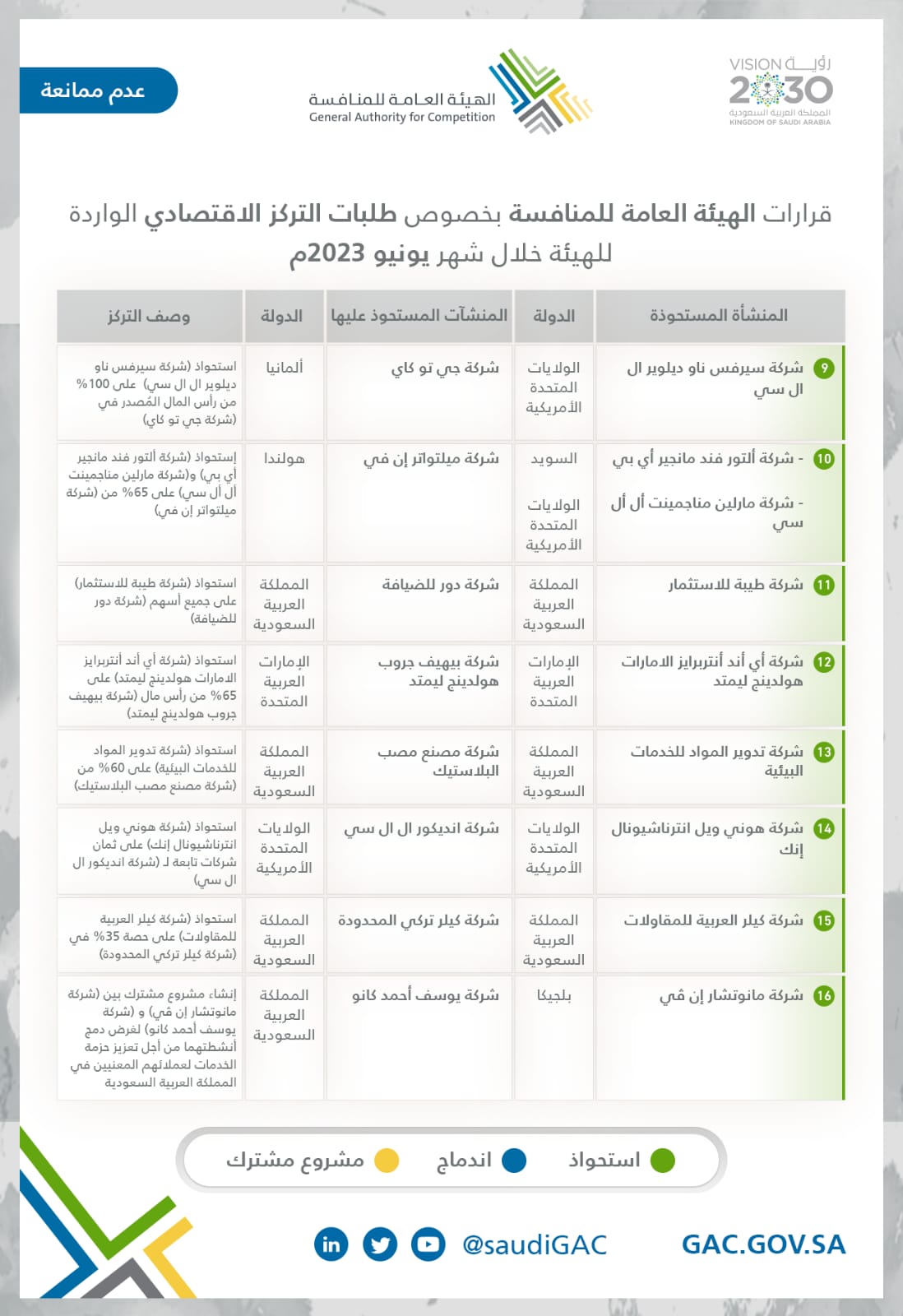 أعلنت الهيئة العامة للمنافسة عن القرارت الصادرة في طلبات التركز الاقتصادي لشهر يونيو 2023م، حيث أصدرت الهيئة 16 قرار عدم ممانعة. وتتلقى الهيئة بلاغات التركز الاقتصادي (الاندماجات والاستحواذات، والمشاريع المشتركة)، فتقوم بدراستها وإصدار القرارات اللازمة. كما تُعْنَى بدراسة السوق والقطاعات في حال وجود مخالفات لنظام المنافسة، أو لتعزيز المنافسة في القطاعات. وقامت الهيئة بإصدار قراراتها بعد دراسة للأسواق المعنية.