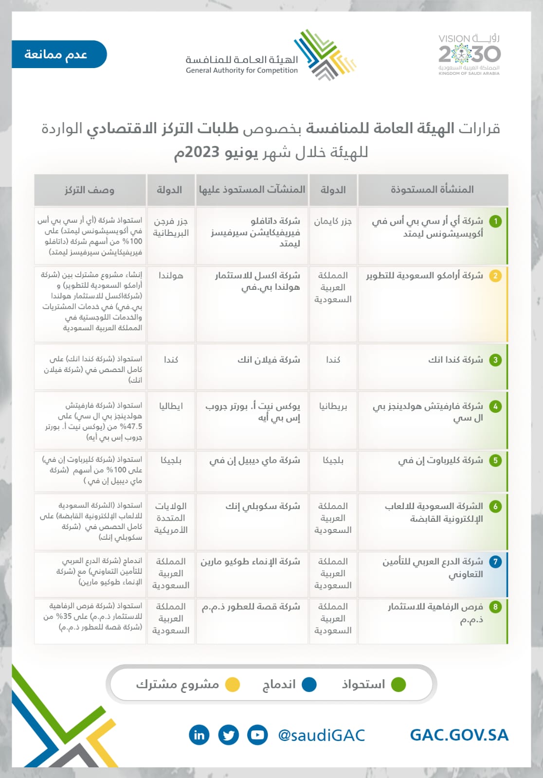 وكان من ضمن الموافقات الصادرة للهيئة العامة للمنافسة في شهر يونيو الماضي، إنشاء مشروع مشترك بين (شركة أرامكو السعودية للتطوير) و (شركةاكسل للاستثمار هولندا بي.في) للخدمات اللوجستية و استحواذ (الشركة السعودية للالعاب الإلكترونية القابضة) على كامل الحصص في (شركة سكوبلي إنك) و اندماج (شركة الدرع العربي للتأمين التعاوني) مع (شركة الإنماء طوكيو مارين) و استحواذ (شركة طيبة للاستثمار) على جميع أسهم (شركة دور للضيافة).