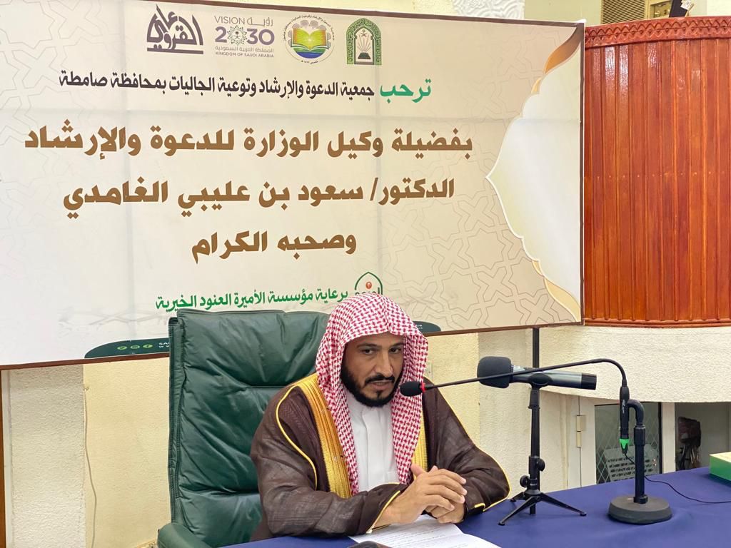بين فضيلة وكيل وزارة الشؤون الإسلامية لشؤون الدعوة والإرشاد الشيخ الدكتور سعود بن عليبي الغامدي أن من سنن الله عز وجل الإظلال والهدايا وأن لله في خلقه شؤون حتى يأخذ العبد بأسباب الهداية ويبتعد عن أسباب الظلال جاء ذلك خلال محاضرة افتتاح دورات الشيخ العلامة عبد الله بن محمد القرعاوي يرحمه الله العلمية في نسختها التاسعة والعشرين المنفذة من قبل فرع الوزارة في منطقة جازان وبالتعاون مع جمعية الدعوة والإرشاد وتوعية الجاليات بمحافظة صامطة والتي جاءت بعنوان ( وسائل الهداية على السراط المستقيم والثبات عليه ) وذلك مساء أمس الجمعة السادس والعشرون من شهر ذي الحجة ١٤٤٤ هجرية والمقامة بجامع العلوم الشرعية . بحضور فضيلة مدير عام الفرع الشيخ أسامة بن زيد المدخلي