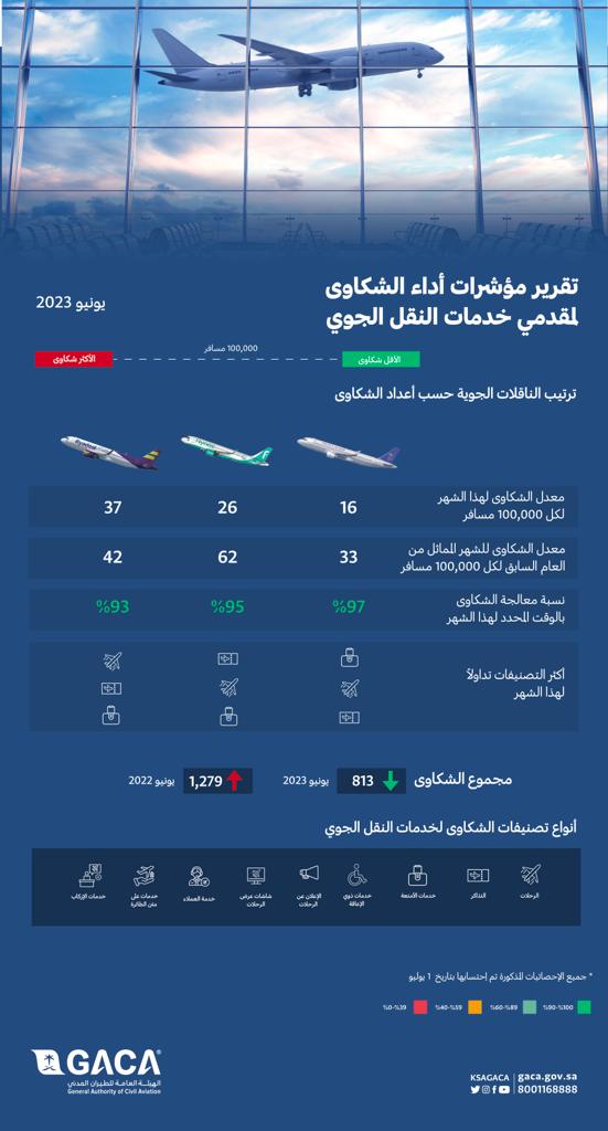 أصدرت الهيئةُ العامة للطيران المدني اليوم، مؤشر تصنيف مقدمي خدمات النقل الجوي والمطارات من واقع عدد الشكاوى المرفوعة من المسافرين للهيئة خلال شهر يونيو 2023م.