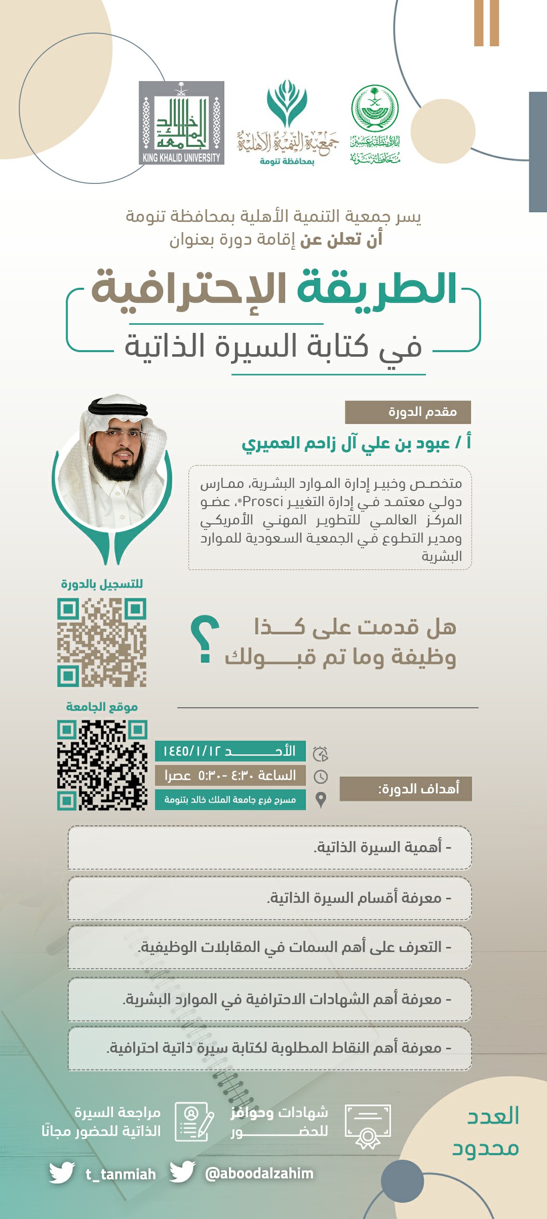 وتهدف الدورة التي يقدمها المدرب الأستاذ عبود بن علي آل زاحم العميري، إلى إبراز أهمية السيرة الذاتية في تعريف الباحثين عن عمل عن أنفسهم بطريقة مهنية، وتسويق مهاراتهم وخبراتهم بين أرباب العمل؛ للحصول على فرصة سواء في العمل أو التدريب أو غير ذلك من الفرص. كما تهدف الدورة إلى التعريف بأقسام السيرة الذاتية، والتعرُّف على أهم السمات في المقابلات الوظيفية، إضافة إلى تسليط الضوء على أهم الشهادات الاحترافية في الموارد البشرية، وأهم النقاط المطلوبة لكتابة سيرة ذاتية احترافية.