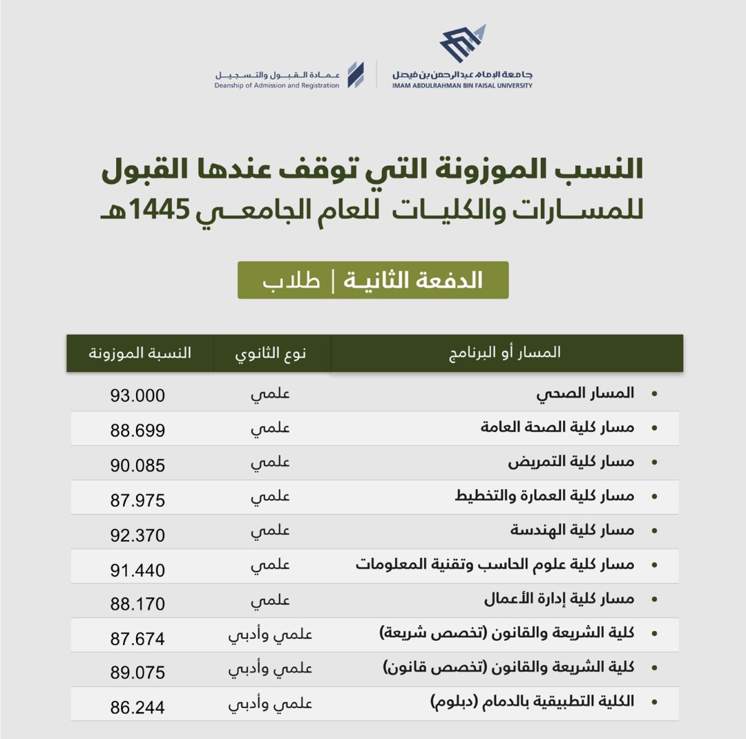 أعلنت جامعة الإمام عبد الرحمن بن فيصل ممثلة بعمادة القبول والتسجيل عن الدفعة الثانية من الطلاب والطالبات المرشحين والمرشحات للقبول في مسارات السنة التحضيرية والبرامج الأخرى للعام الجامعي 1445هـ