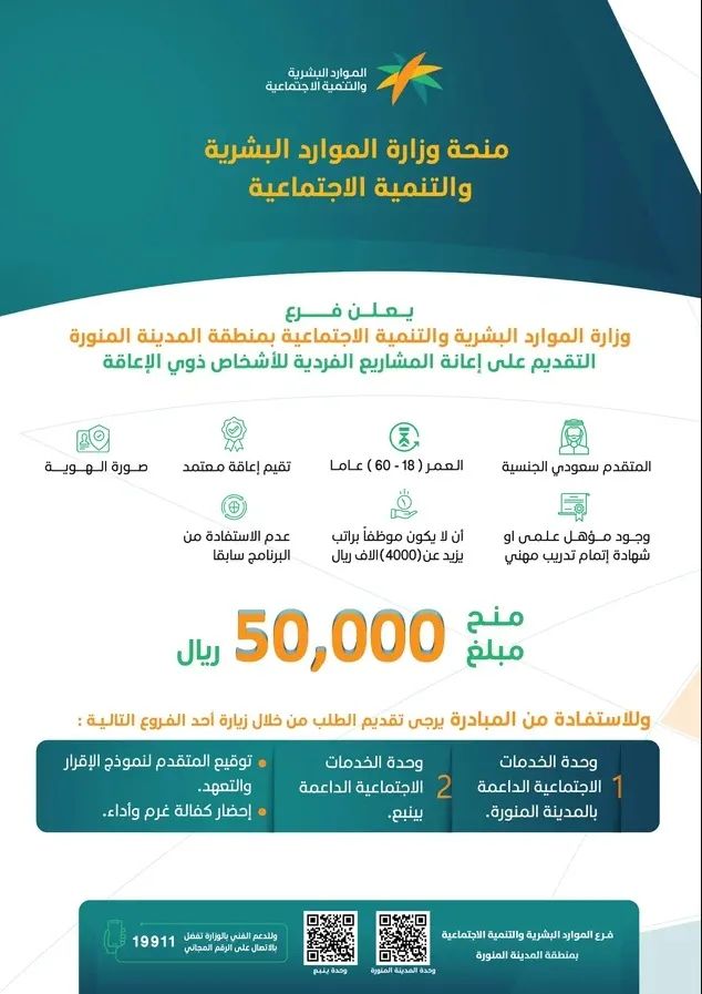 قدم فرع وزارة الموارد البشرية والتنمية الاجتماعية بمنطقة المدينة المنورة منحة بمبلغ 50 ألف ريال كإعانة للمشاريع الفردية للأشخاص ذوي الإعاقة.
