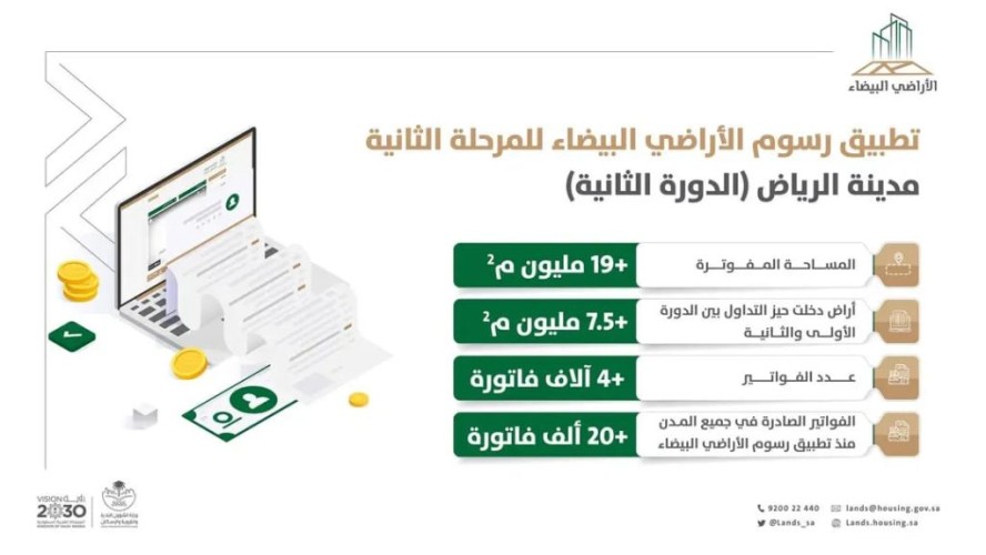 وذلك بين الدورتين الفوتريتين الأولى والثانية من المرحلة الثانية في مدينة الرياض، حيث أُصدر في الدورة الثانية أكثر من 4 آلاف فاتورة على مساحات تصل إلى 19 مليون م2، داعياً ملَّاك الأراضي الخاضعة للرسوم إلى المبادرة بإعمار أراضيهم أو السداد خلال سنة من تاريخ إصدار القرار.