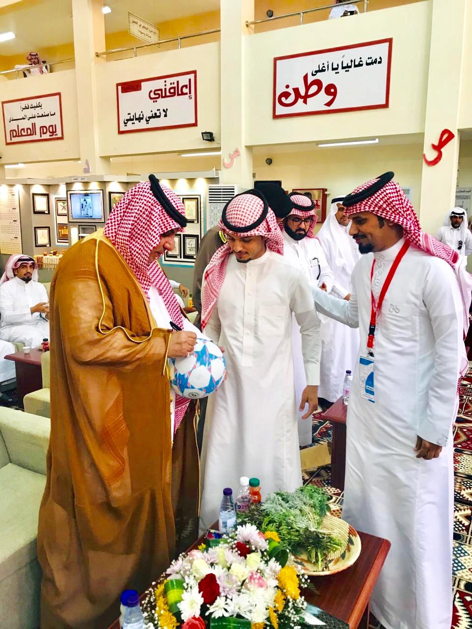 ثم تقدم الطالب فيصل عبدالرحمن مساعد المشارك مع الاتحاد السعودي للصم من مدرسة الملك عبدالله الثانوية لتوقيع المحافظ على كرة القدم كتذكار شخصي.