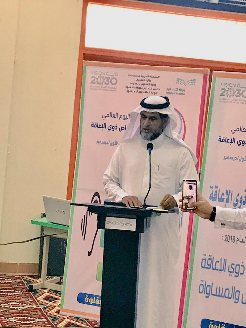 معلنا تجديد البيعة والولاء لولاة الأمر ومستعرضاً ما يحظى به التعليم من رعاية واهتمام مستحضرا شواهد الدعم الكبير الذي يجده التعليم ثم قدم شكره للمحافظ على دعمه لبرامج التعليم بالمحافظة وشكر رئيس قسم التربية الخاصة الأستاذ عبدالله الحميدي وزملاءه مشرفي التربية الخاصة ومديري مكتبي قلوة والحجرة وقادة المدارس على جهودهم المميزة في الاحتفاء باليوم العالمي للاعاقة.
