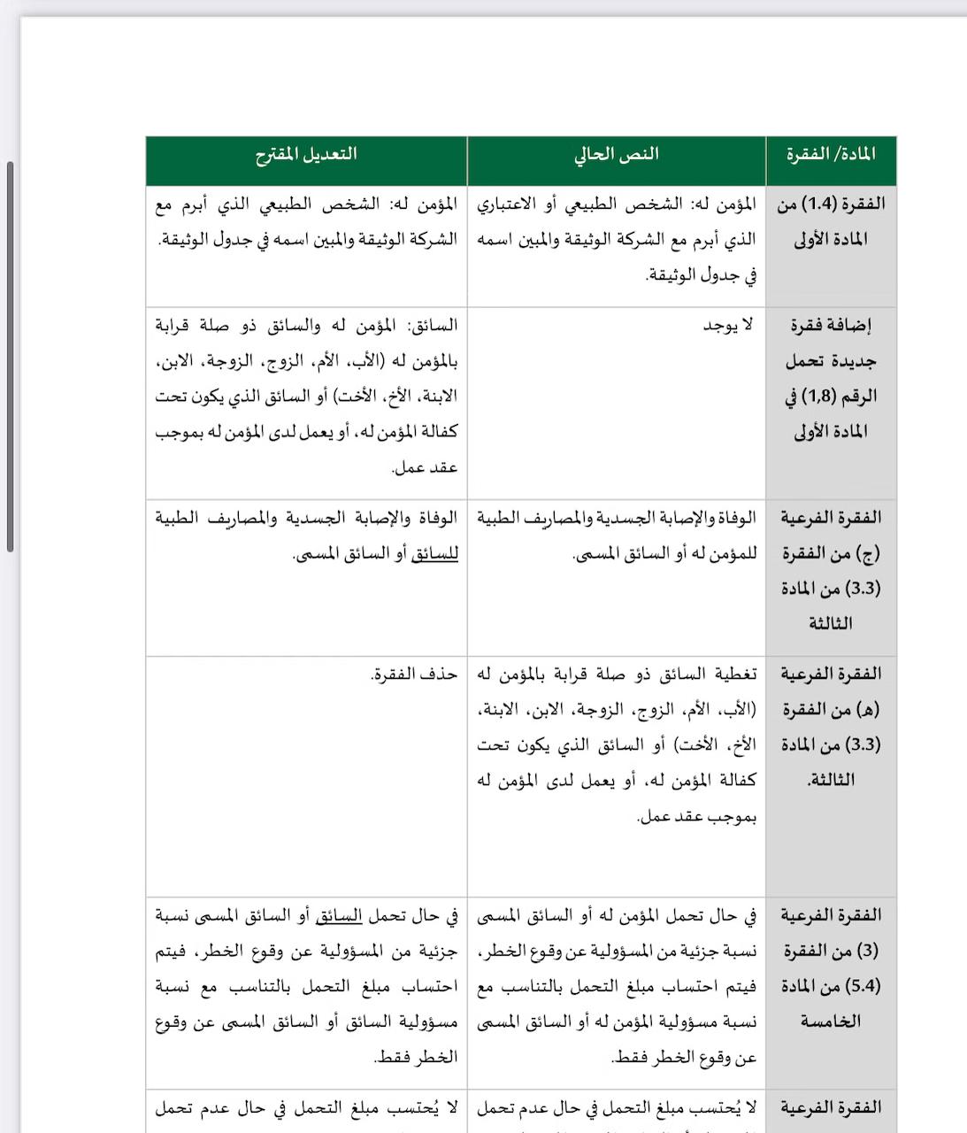 كشف المشروع الجديد لتعديلات التأمين على المركبات، الذي طرحه البنك المركزي شمول تأمين مركبة العامل الذي يعمل لدى المؤمن، بشرط أن يكون هناك عقد للسائق الذي يكون تحت كفالته، ويشمل أيضاً السائق ذا صلة القرابة بالمؤمن له، وهم (الأب، الأم، الزوج، الزوجة، الابن، الابنة، الأخ، الأخت).