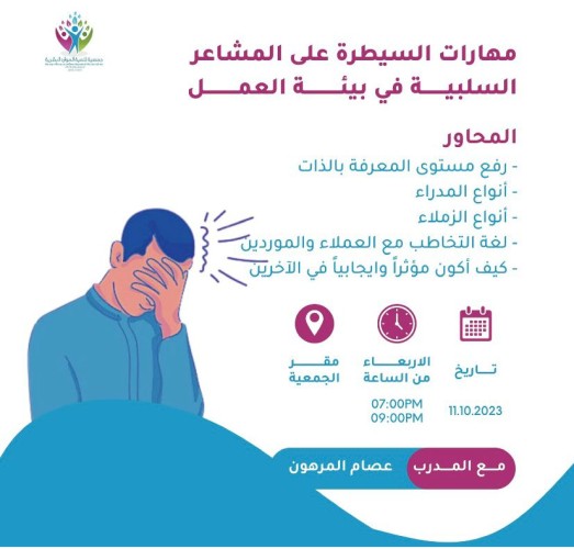 وأوضحت الجمعية ان الورشة تتضمن عدة محاور منها إدارة الغضب ، رفع مستوى المعرفة با الذات ، أنواع المدراء ، أنواع الزملاء ، لغة التخاطب مع العملاء والموردين ، كيف أكون مؤثراً وإيجابياً في الآخرين .
