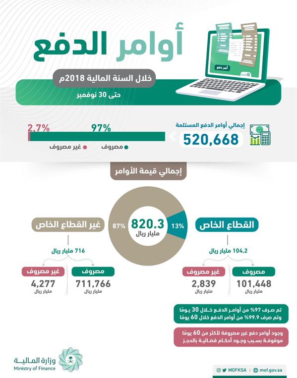 أعلنت وزارة المالية أن عدد أوامر الدفع التي تسلمتها خلال السنة المالية 2018، حتى 30 نوفمبر بلغت أكثر من 520 ألف أمر دفع بقيمة تتخطى 820 مليار ريال.