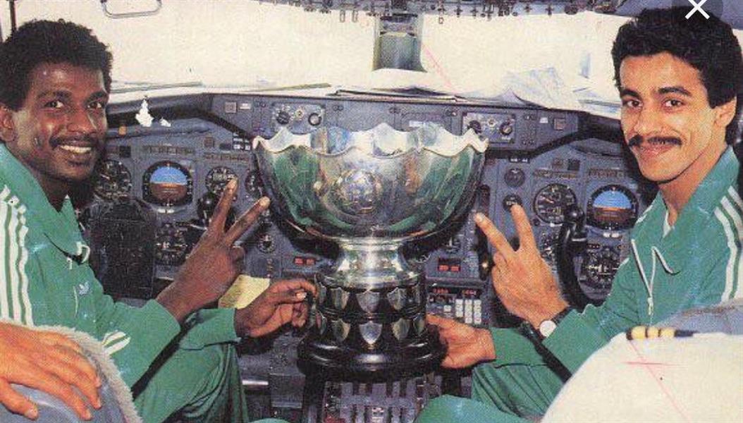 ونشر ماجد عبدالله عبر حسابه في “تويتر” صورة له برفقة لاعب الهلال السابق وقائد المنتخب السعودي وقتها صالح النعيمة، وهما يجلسان بمقصورة القيادة في الطائرة التي نقلتهما إلى المملكة وبرفقتهما الكأس.