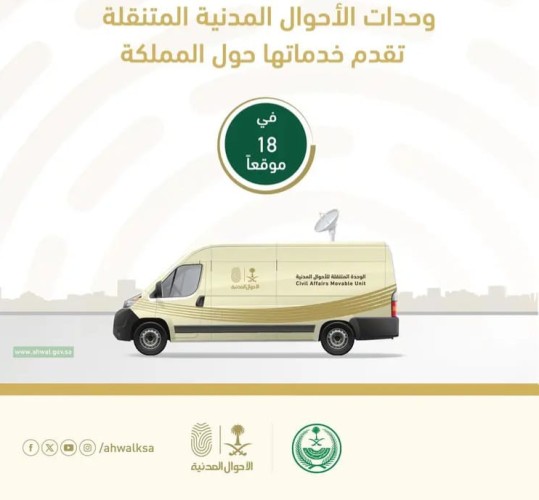تقدم الوحدات المتنقلة للأحوال المدنية خدماتها للرجال والنساء في (18) موقعًا حول المملكة، وذلك ضمن مبادرة “نأتي إليك” التي تنفذها وكالة وزارة الداخلية للأحوال المدنية للجهات الحكومية والخاصة، ومبادرة “موجودين” الموجهة لخدمة المحافظات والمراكز والقرى البعيدة عن مكاتب الأحوال المدنية.