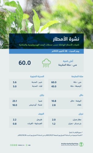 جاء ذلك في تقريرٍ لوزارة البيئة والمياه والزراعة؛ لرصد كميات هطول الأمطار في مناطق المملكة كافة، من خلال (48) محطة رصد هيدرولوجية ومناخية.