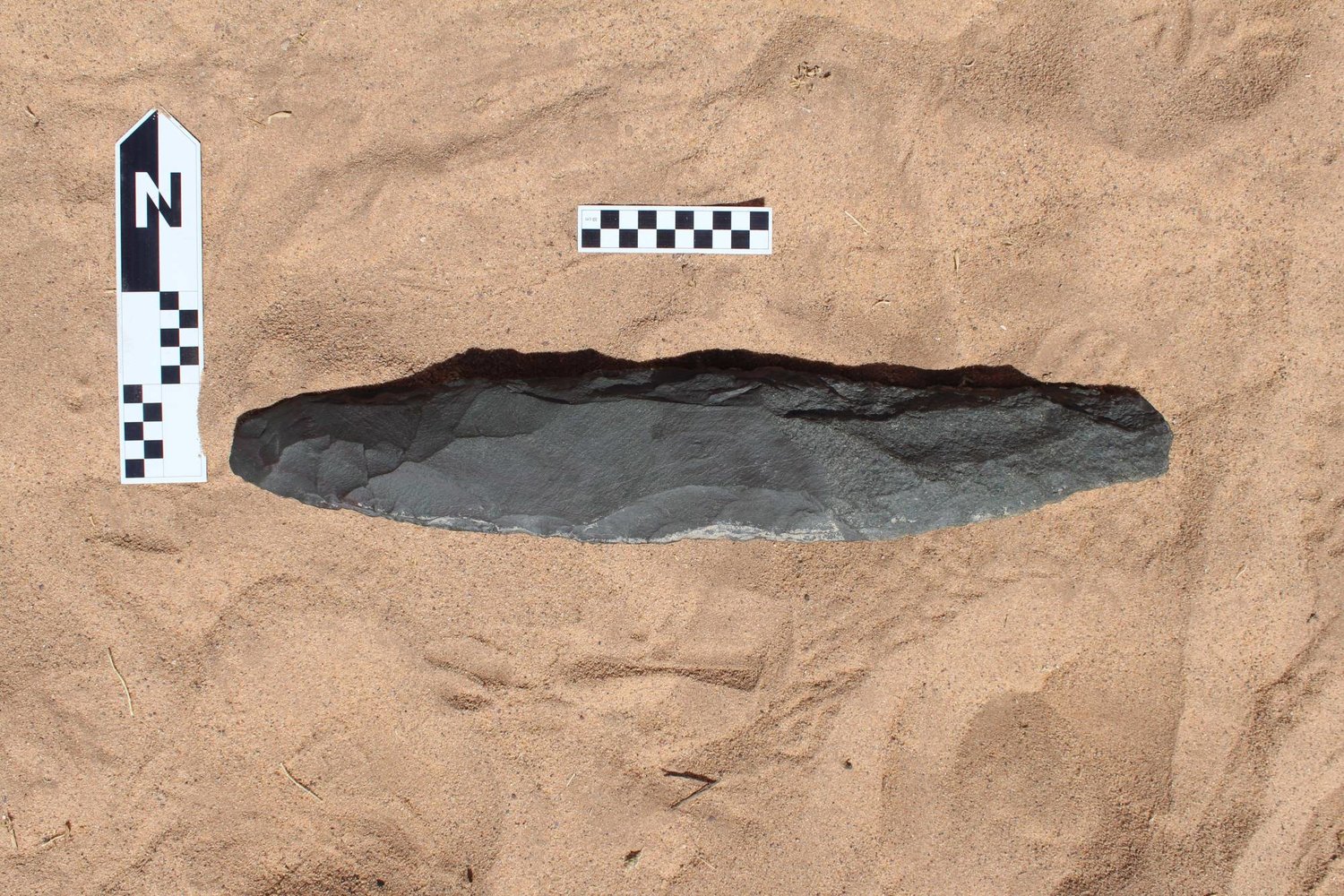 ويبلغ طول الأداة الحجرية المصنوعة من البازلت الناعم 51.3 سم، وقد تم حفرها على كلا الجانبين لإنتاج أداة قوية ذات حواف قطع أو تقطيع قابلة للاستخدام، ولا تزال تجري الدراسات لمعرفة الدور الذي تستخدم فيها الفأس اليدوية.