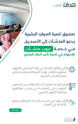 دعا صندوق تنمية الموارد البشرية؛ جميع المنشآت بمختلف نطاقاتها وأحجامها ونوعها سواءً خاص أو غير ربحي أو حكومي أو شبه حكومي إلى المبادرة بالتسجيل في خدمة دروب منشآت (إحدى خدمات منصة برنامج التدريب الإلكتروني دروب)؛ حيث تتيح الخدمة للمنشآت الاستفادة من المحتوى المتوفر على المنصة في تدريب موظفيها ومتابعة أدائهم التدريبي بما يتوافق مع الاحتياجات التدريبية للموظف والمنشأة؛ والتي تساهم في تحسين الكفاءة ورفع الإنتاجية في العمل.