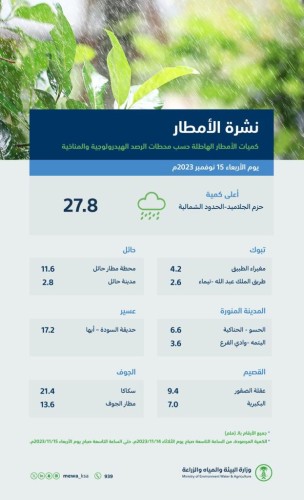 وأوضح التقريرٍ اليومي لوزارة البيئة والمياه والزراعة أنه من خلال (67) محطة رصد هيدرولوجية ومناخية، تم رصد كميات هطول أمطار على مناطق: (مكة المكرمة، المدينة المنورة، القصيم، عسير، حائل، تبوك، الحدود الشمالية، الشرقية، والجوف)، بكميات تفاوتت بين(27.8) ملم و(0.5) ملم، وذلك من الساعة التاسعة صباح أمس الثلاثاء 14 نوفمبر، حتى الساعة التاسعة صباح اليوم الأربعاء 15 نوفمبر 2023م.