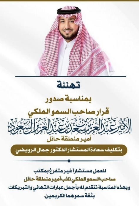 أصدر صاحب السمو الملكي، الأمير “عبد العزيز بن سعد آل سعود، أمير منطقة حائل، قراراً يقضي بتكليف سعادة المستشار الدكتور “جمال الرويضي”، للعمل مستشار غير متفرغ في مكتب سموه”.