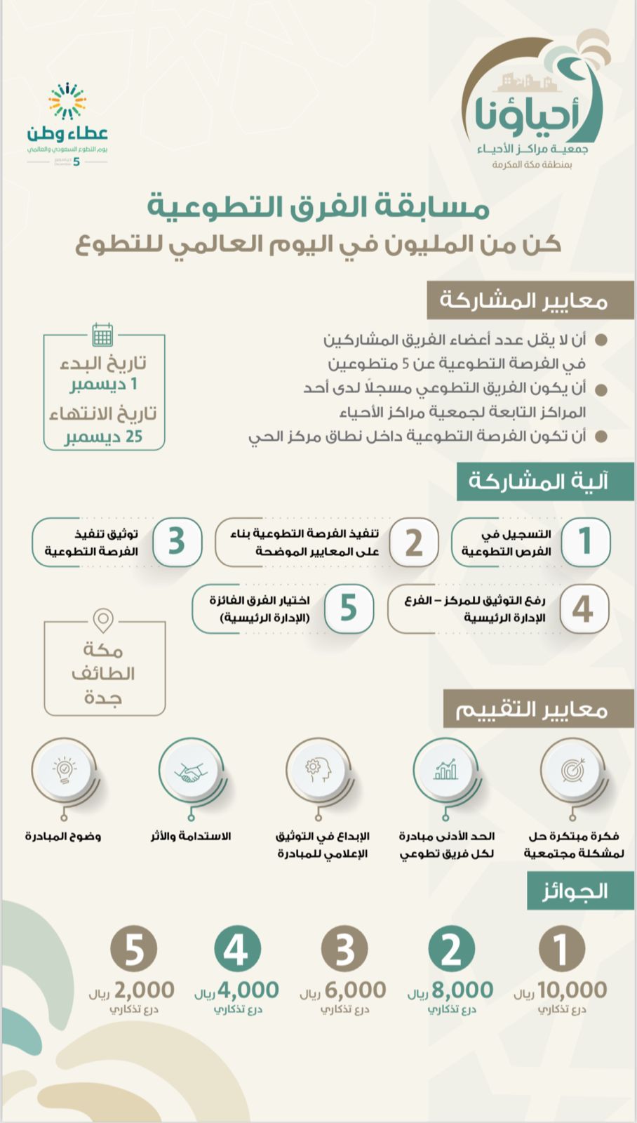 بمناسبة اليوم العالمي للتطوع الخامس من ديسمبر ، واسهاماً في تحقيق رؤية المملكة ٢٠٣٠ للوصول إلى مليون متطوع تطلق جمعية مراكز الآحياء بمنطقة مكة المكرمة مسابقة للمراكز والفرق التطوعية التابعة لها بالفروع الثلاث للجمعية – فرع العاصمة المقدسة، فرع الطائف ،و فرع جدة ، تحت شعار كن من المليون