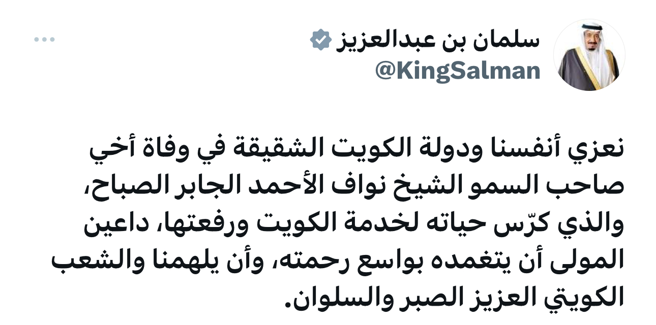 وقال الملك سلمان عبر حسابه بمنصة “إكس”: “نعزي أنفسنا ودولة الكويت الشقيقة في وفاة أخي صاحب السمو الشيخ نواف الأحمد الجابر الصباح”.