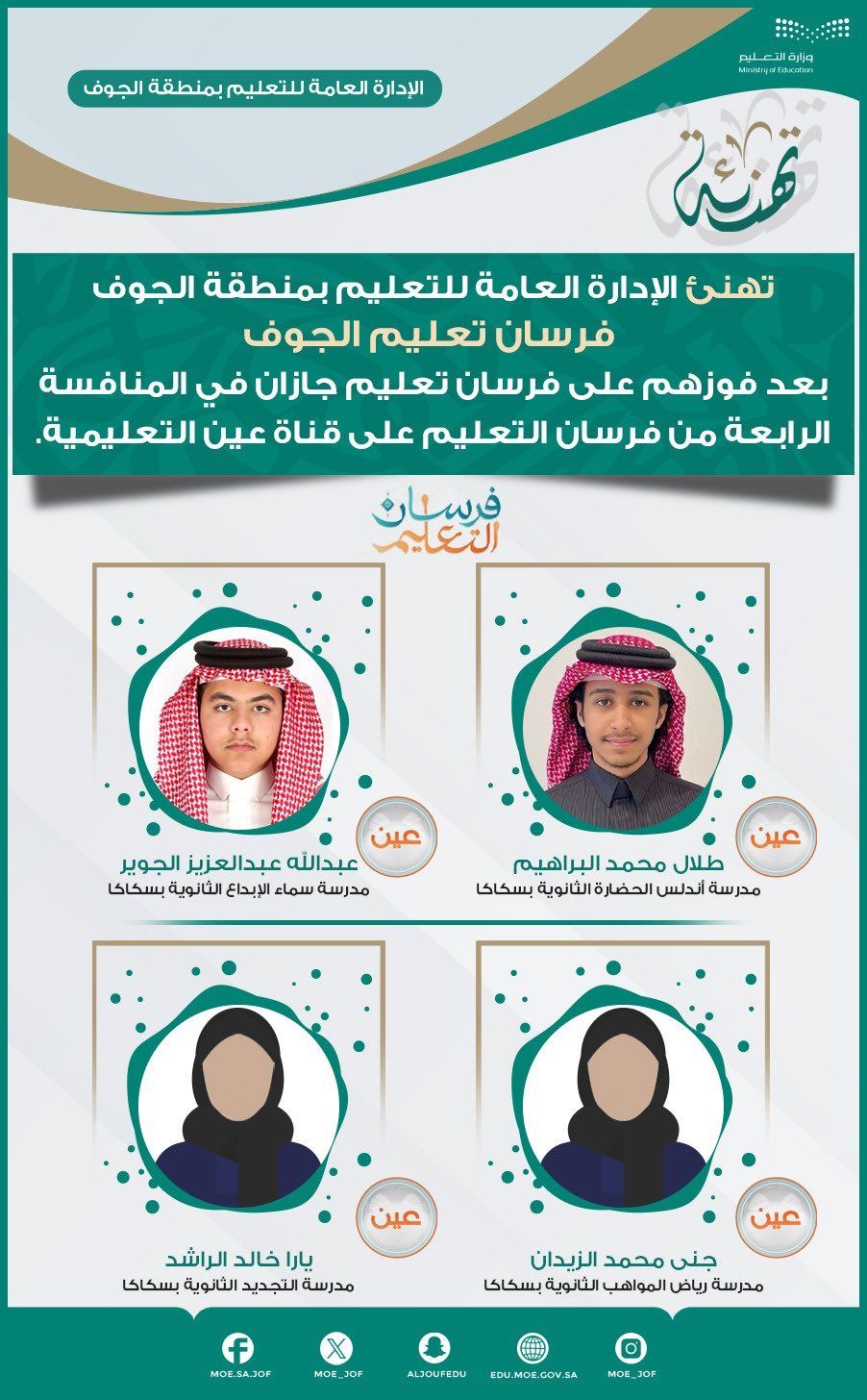وضم فريق فرسان الجوف الطلاب طلال البراهيم، عبدالله الجوير، جنى الزيدان، ويارا الراشد، فيما ضم فريق فرسان جازان الطلاب البراء تقي، عبدالله العيدروس، سيما الصميلي، وريناد دحباش، وتنوعت هواياتهم بين الرسم والتصميم والقراءة والرياضة.