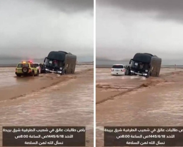 تداول رواد موقع التواصل الإجتماعي “إكس” مقطع فيديو يرصد من خلاله احتجاز عدد من الأشخاص داخل حافلة، علقت وسط سيول شعيب الطرفية شرق بريدة.