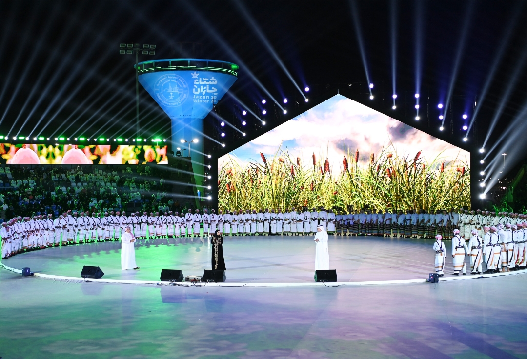 وشاهد سمو أمير جازان والحضور لوحة فنية غنائية تحكي قصة التطور والنمو في منطقة جازان وثقافة وعادات وتقاليد المنطقة وعادات الكرم وحسن الضيافة تحت عنوان ” في جازان تتحقق الامنيات” ، وعروض الفرق الشعبية التي تمثل مختلف محافظات المنطقة.