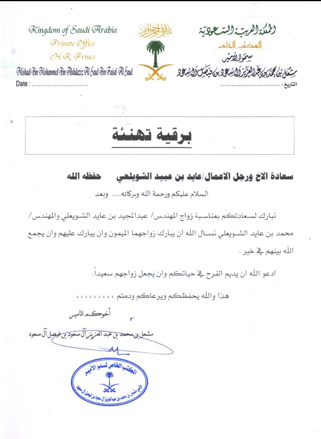 قدم سمو الأمير “مشعل بن محمد بن عبدالعزيز آل سعود بن فيصل آل سعود” برقية تهنئة إلى رجل الأعمال “عايد بن عبيد الشويلعي” وذلك بمناسبة زواج أبنائه.