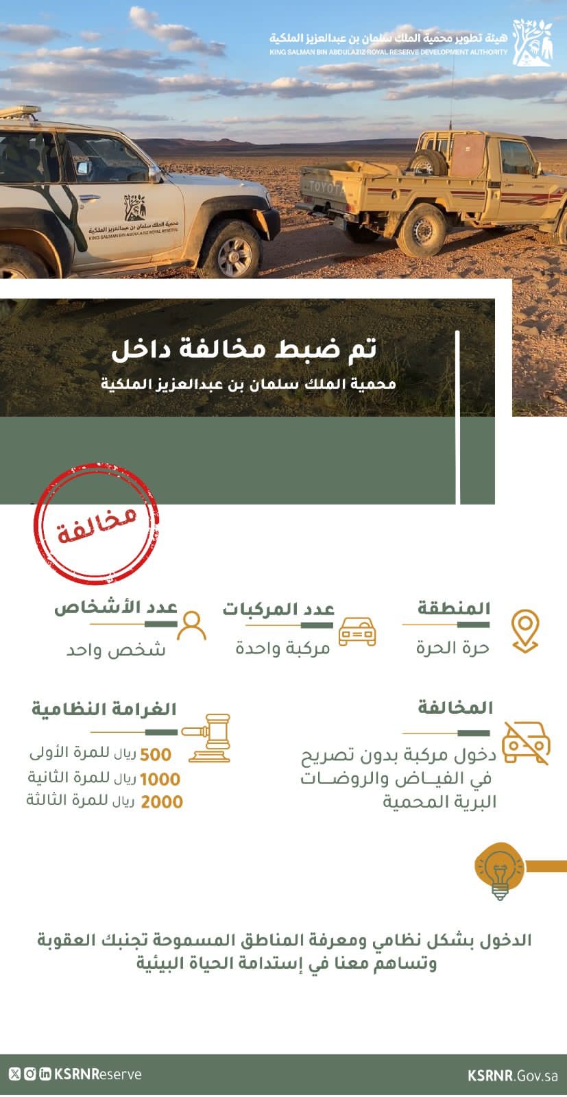 محمية الملك سلمان بن عبدالعزيز الملكية تضبطُ مركبتين و 4 اشخاص مخالفين في محمية حرة الحرة