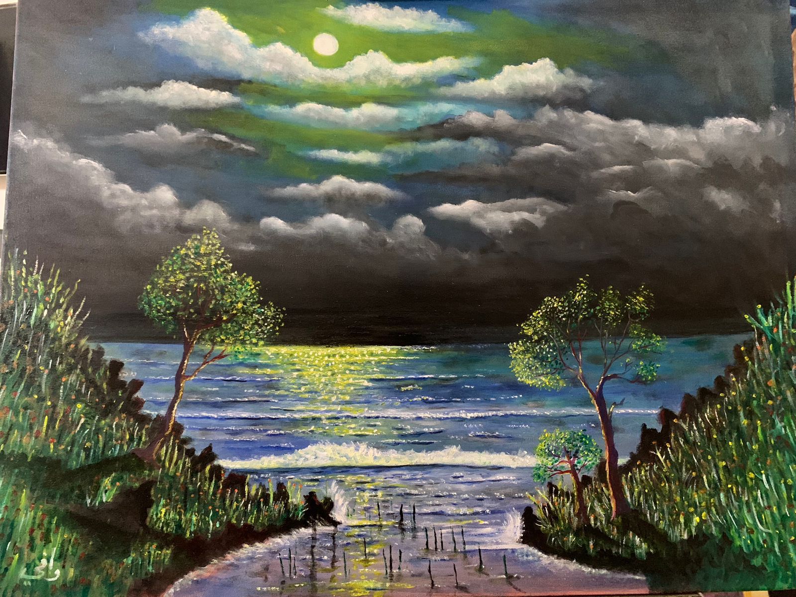 وتتحدث هذه اللوحة الجميلة عن غروب القمر وانعكاسه على البحر يعطي جمالاً وراحة عند المشاهدة.