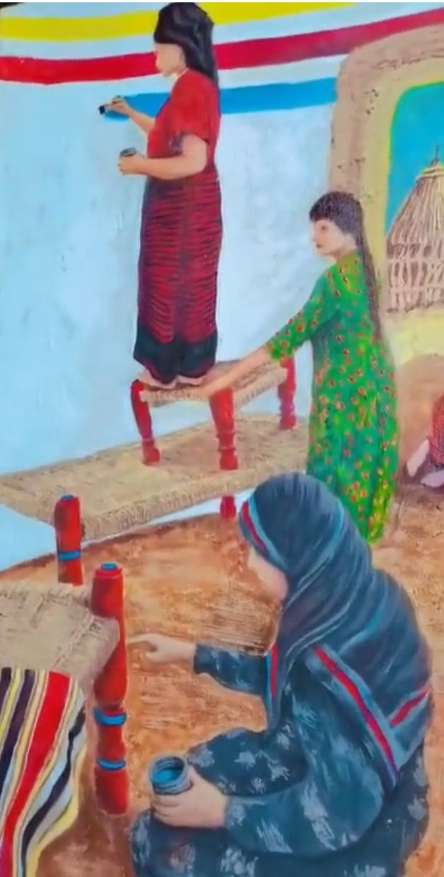 الكراسي والقعد وتزخرفها بأجمل الألوان وتقوم بتحضير البوية الحمراء والقطران الاسود وتدهن منزلها المبني من العشة بأجمل الألون وتنتشر رائحة البويا في كل مكان .