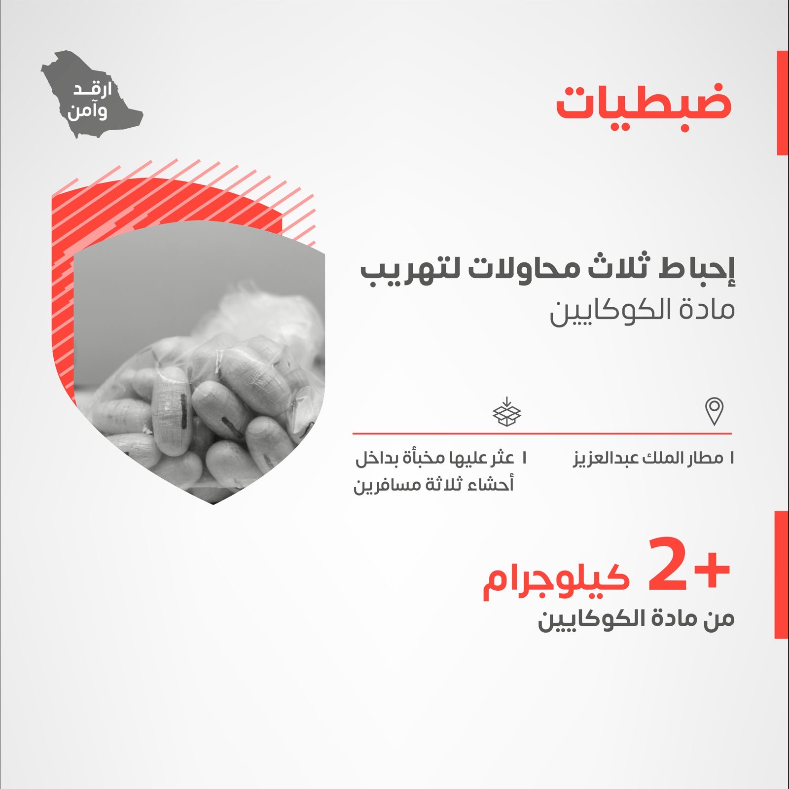 تمكنت هيئة الزكاة والضريبة والجمارك في مطار الملك عبدالعزيز الدولي بجدة، من إحباط عدد من المحاولات لتهريب أكثر من 2 كيلوجرام من الكوكايين و 878.2 جرام من الهيروين.