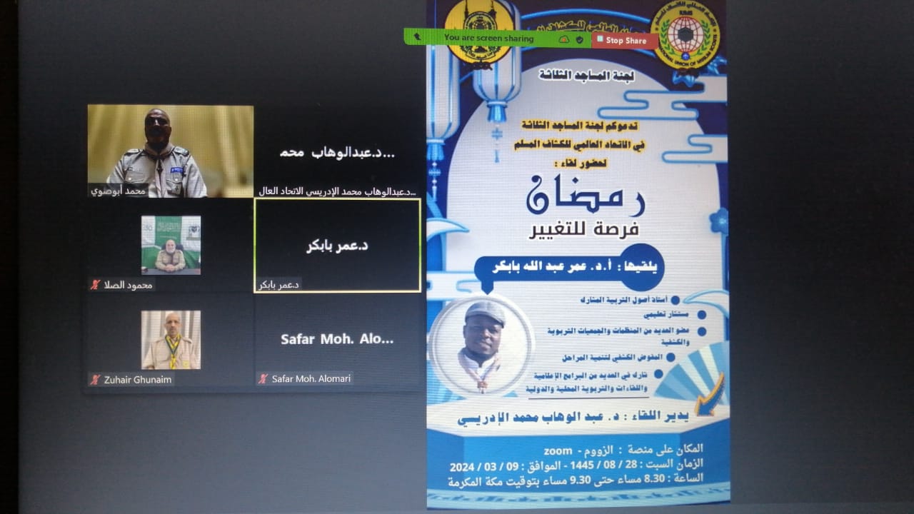 الاتحاد العالمي للكشاف المسلم ممثلاً بلجنة المساجد الثلاثة قدّم لقاء عبر منصة الزووم ، بعنوان : رمضان فرصة للتغيير من إعداد وتقديم الدكتور عمر بن عبدالله بابكر أستاذ أصول التربية المستشار التعليمي والمفوض الكشفي الدولي