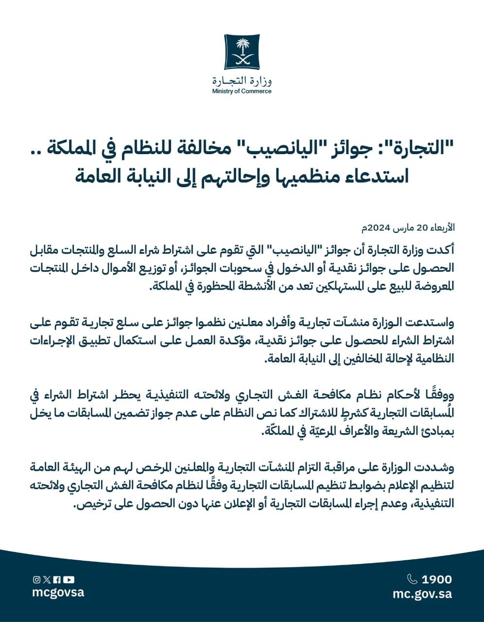وقامت الوزارة باستدعاء منشآت تجارية وأفراد معلنين نظموا جوائز على سلع تجارية تقوم على اشتراط الشراء للحصول على جوائز نقدية، مؤكدة العمل على استكمال تطبيق الإجراءات النظامية لإحالة المخالفين إلى النيابة العامة.