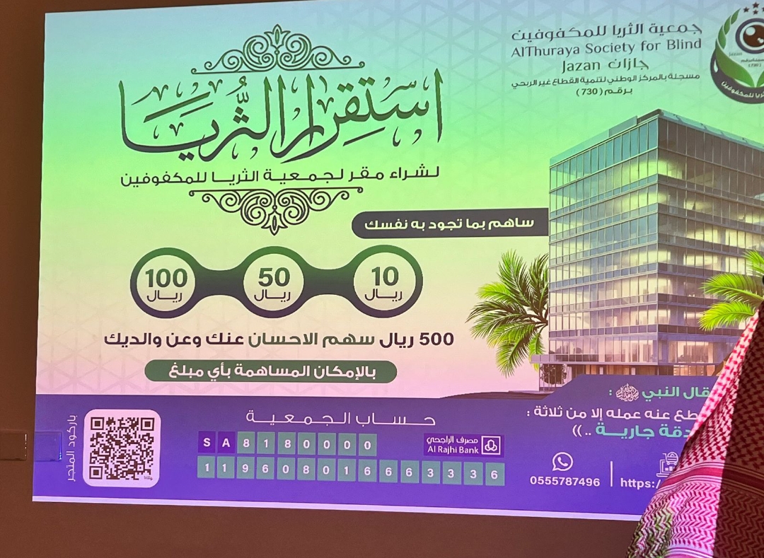 مشيرة الى ان فئة المكفوفين غالية على قلب خادم الحرمين الشريفين وسمو ولي العهد – حفظهم الله ، وجمعية الثريا تقوم بتقديم التدريب والتأهيل لكافة الفئات