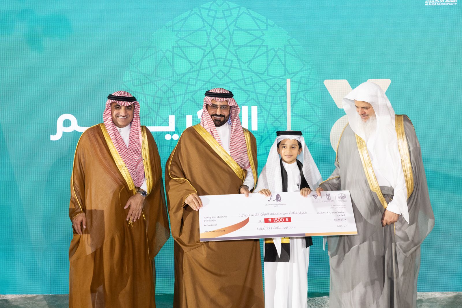 تحت رعاية صاحب السمو الملكي الأمير سعود بن طلال بن بدر محافظ الأحساء، كرم سعادة وكيل محافظة الأحساء الأستاذ معاذ بن إبراهيم الجعفري، اليوم “ الأربعاء “ الفائزين في مسابقة أمانة الأحساء “ورتل” للقرآن الكريم، ومسابقة “بلال” لأجمل صوت في أداء الآذان، كما كرم سعادته تسعة حافظين للقرآن الكريم من جمعية تحفيظ القرآن الكريم بالأحساء ، وذلك بحضور أصحاب الفضيلة، وعدد من مسؤولي الجهات الحكومية والداعمين