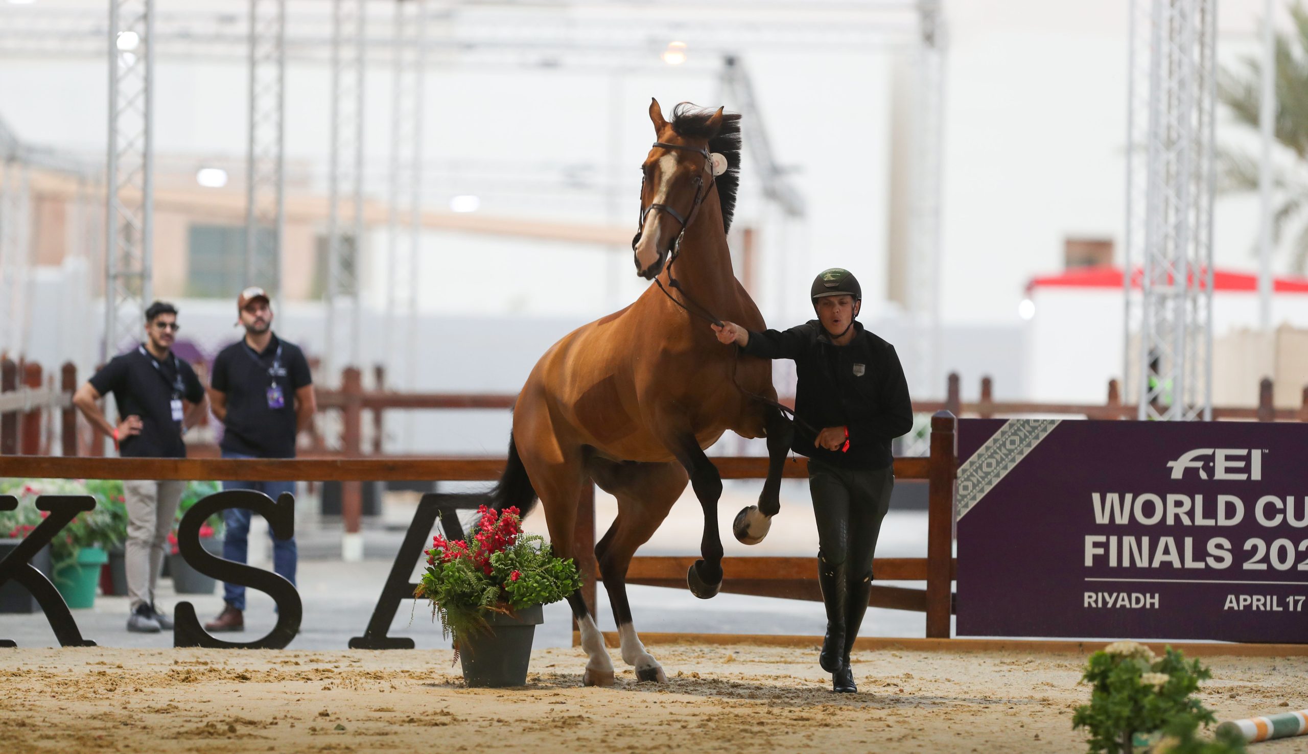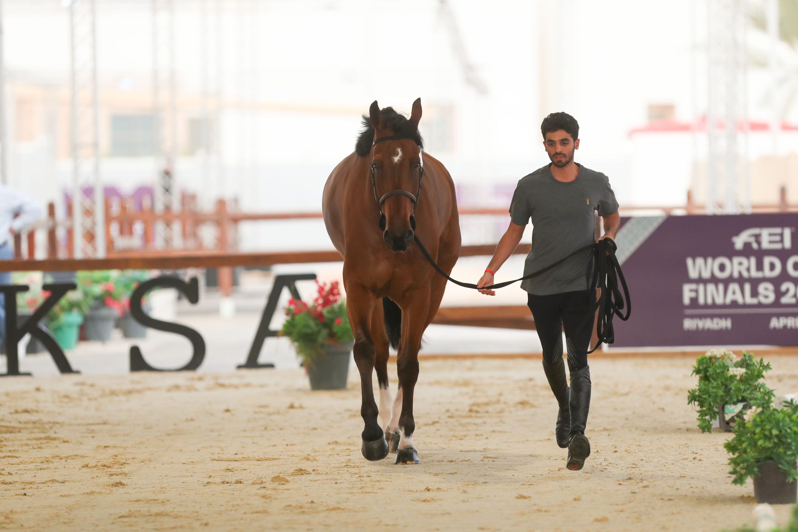 فحص جياد كأس العالم لقفز الحواجز والترويض والفرسان يجرون تدريبهم الأول