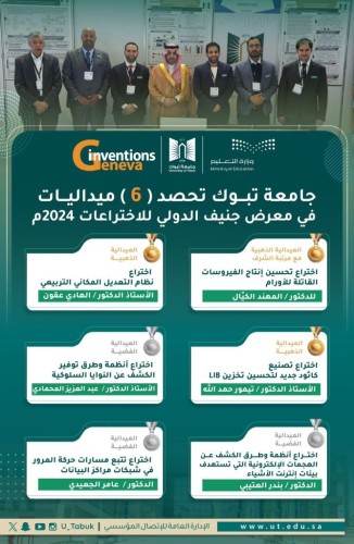 حصدت جامعة تبوك ( 6 ) ميداليات ذهبية وفضية في معرض جنيف الدولي للاختراعات 2024م، وذلك من خلال الاختراعات والابتكارات المشاركة ضمن جناح وزارة التعليم بالمعرض في دورته الـ 49 خلال الفترة من 17 – 21 أبريل 2024م؛ بمشاركة 26 جامعة سعودية.