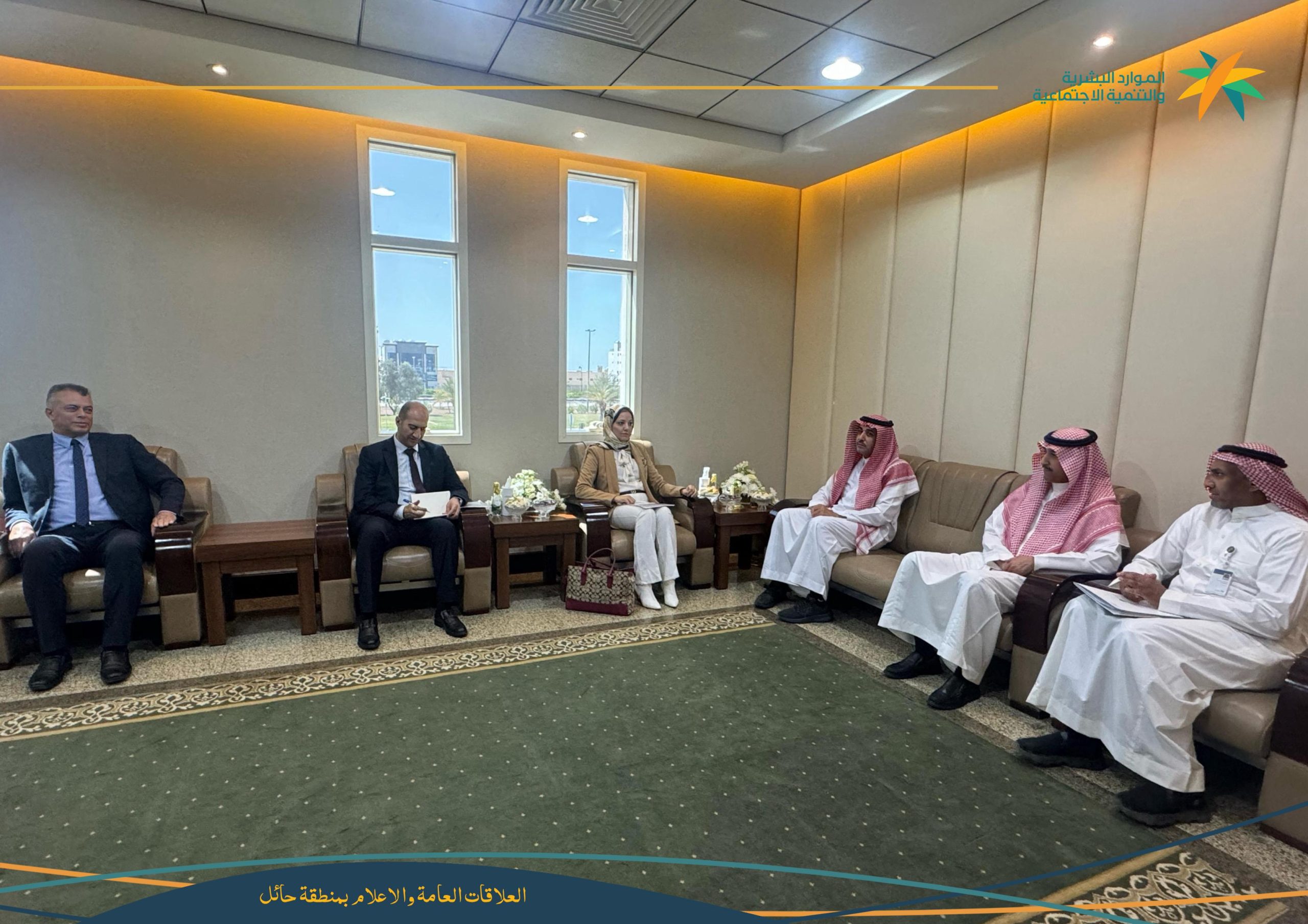 استقبل سعادة مدير عام فرع وزارة الموارد البشرية والتنمية الاجتماعية بحائل فريح بن محمد العياد بمكتبه بالفرع القنصل المصري السيدة مروة محمد الحسيني يرافقها السيد محمد عواد محمد حيث تم استعراض عدد من الموضوعات ومناقشتها وعلى رأسها متابعة أوضاع الجالية المصرية بالمنطقة في الجوانب التي تخص العمل وغيرها ضمن اختصاصات وأدوار فرع الوزارة .