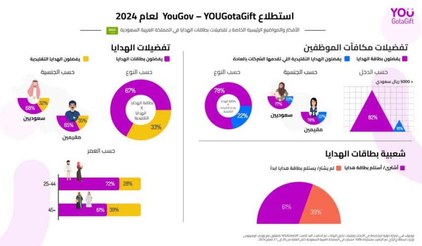 أفادت دراسة حديثة أن ما يقارب سبعة من كل عشرة (68%) مواطنين سعوديين يفضلون تلقي بطاقات الهدايا على الهدايا التقليدية، فيما يعد نتيجة مهمة ذات تأثير كبير على أصحاب العمل والعلامات التجارية على حد سواء، وذلك في استطلاع أجرته شركة “يو جوف” YouGov عبر الإنترنت، وهي مجموعة دولية متخصصة في تكنولوجيا البيانات والتحليلات البحثية، بالتعاون مع شركة “يو جوت أجيفت” YOUGotaGift، الرائدة في مجال بطاقات الهدايا الرقمية في الشرق الأوسط وشمال أفريقيا، وشمل الاستطلاع رأي أكثر من 1000 مشارك في السعودية.